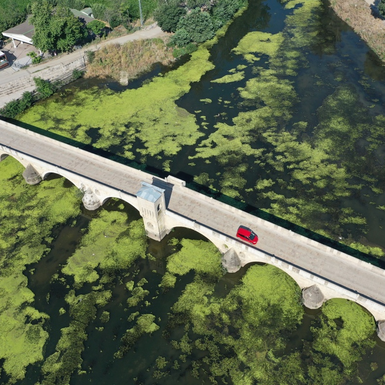 Edirne’den geçen Tunca Nehri’nin yüzeyinin bir bölümünde aşırı sıcaklar ve su akışının durağanlaşması nedeniyle yosun ve su mercimekleri oluştu. DSİ nehir ölçümleri raporuna göre Tunca’nın debisi saniyede 4 metreküp ölçüldü.